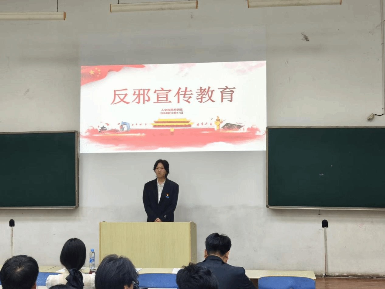 为准确把握新时代反邪教工作新形式新要求,进一步加强我院师生识邪、拒邪、反邪意识。2024年9月12日,人文与艺术学院在教学北楼C104开展了“崇尚科学,反对邪教”教育宣传活动。