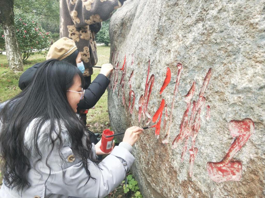 活动开始,志愿者们拿着画笔和颜料在景观石上进行修复描红。尽管寒风呼啸,志愿者们仍坚持描红,服务校园文化的传播,传承校园文化的精神。在负责人的带领下,志愿者们高效的完成了本次的活动,志愿者用勤劳的双手,让原本黯淡的景观石焕然一新。最后,参与活动的相关人员一同在修复描红完的景观石前合影留念。