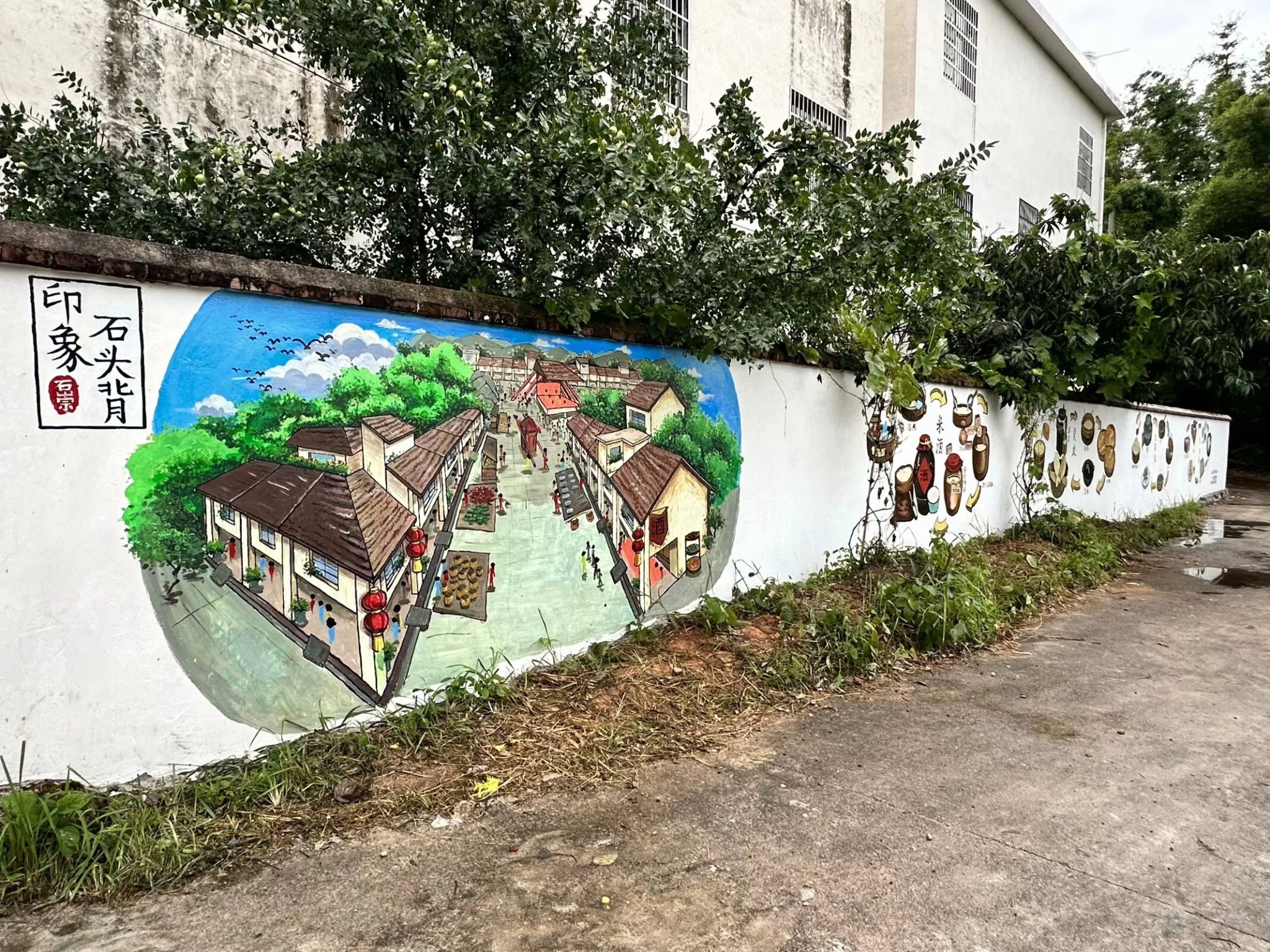 实践团成员以笔墨为媒,创意绘制乡村的斑斓画卷。老街记忆跃然墙上,仿佛能让人穿越时空,回到那宁静而古朴的年代,勾起无尽的乡愁;香飘四溢的米酒制作流程也生动地展现了石崇独特的酒文化和传统酿造技艺;烫皮、米包果、九层皮等特产技艺绽放光彩,展示了石崇丰富多样的传统手艺。