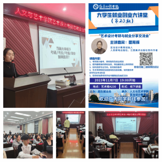 117日,由招生就业处主办,人文与艺术学院承办的“大学生就业创业大讲堂”第20期在艺术楼A230开讲。本次交流会邀请亚当设计教育创始人、人民邮电出版社、江西美术出版社签约作者瞿育辉,以“艺术类设计考研与就业”为主题,从考研择校指导、高分备考及就业规划三方面展开讲述。全校近100名学生参加。交流会上,瞿育辉从如何选择考研专业方向展开说明,鼓励同学们结合考研动机和专业对口性,做好心理建设和自我评估,提前规划,掌握查找考研学科及考试科目的方法。瞿育辉以自己备考经历为切入点,细致地分析备考各阶段的特点,结合自己的职业生涯分析艺术设计专业就业前景,鼓励同学们做好职业发展的长远规划,不断提升职业能力,更好匹配职业需求。(文/图 兰龙焱)