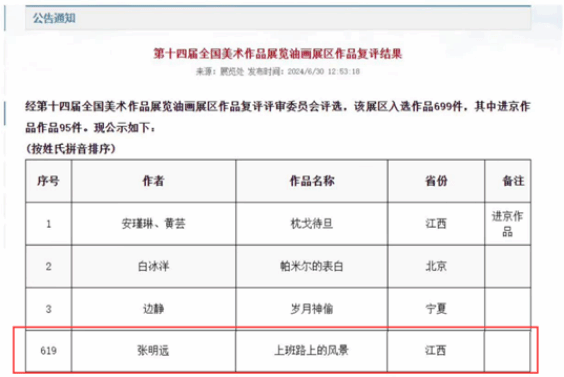 据悉,全国美展是由文化和旅游部、中国文学艺术界联合会、中国美术家协会联合主办,代表中国美术最高水平的综合性大展,每五年举办一次。本届全国美展共分为13个分展区,漆画展区共收到投稿作品近五千余件,经过两轮评审最终评选出入展作品201件,其中进京作品27件(江西省入选作品14件,其中进京作品7件)。油画展区入选作品699件,其中进京作品95件。进京作品将于展览结束后由各分展区统一送至中国美术馆,并在75周年国庆期间集中展出。