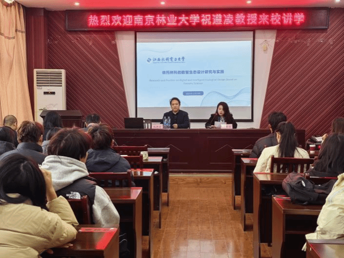 2025 年 12 月 4 日,南京林业大学艺术设计学院院长祝遵凌教授应邀做客我校“鄱湖学术讲坛”,在艺术楼 A230 会议室带来题为《依托林科的数智生态设计研究与实践》的专题讲座。本次讲坛聚焦数智技术与生态设计的交叉融合,为在场师生带来了一场兼具学术高度与实践指导意义的精彩分享。