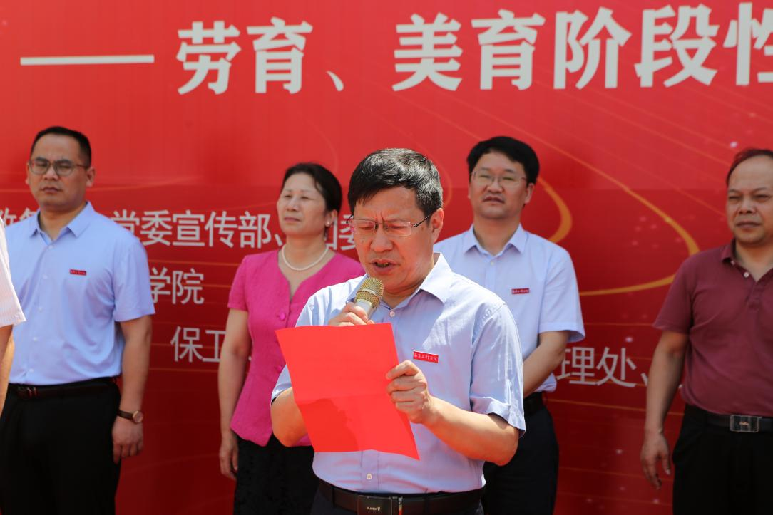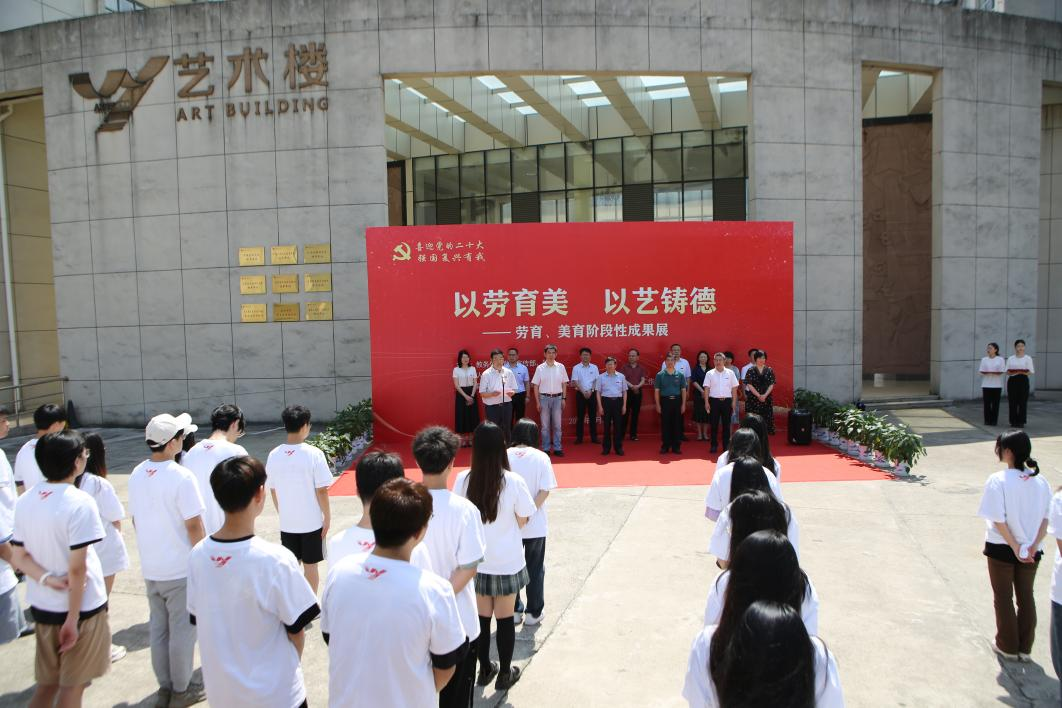 6月8日,我校举办“以劳育美 以艺铸德”劳动教育、美育教育阶段性成果展,深入学习贯彻习近平新时代中国特色社会主义思想,落实党中央和总书记坚持立德树人要求,推动“德智体美劳”五育并举、提升校园文化建设品质,以实际行动迎接党的二十大胜利召开。此次展览由人文与艺术学院承办,全面展示学校“专业+”劳育、美育实践活动的阶段性成果。出席本次展览活动的校领导有:校长汪胜前、副书记吴泽俊、副校长李培生、纪委书记殷安全、副校长周敏丹、副校长陆伟锋。纪委书记殷安全主持开幕式,副校长陆伟锋发表讲话,校长汪胜前宣布展览开幕。教务处、党委宣传部、工会、团委、学生工作部(处)、资产与实验室管理处、后勤保障处、保卫处、教育教学评估中心等部门负责人以及人文与艺术学院50名师生代表参加活动。