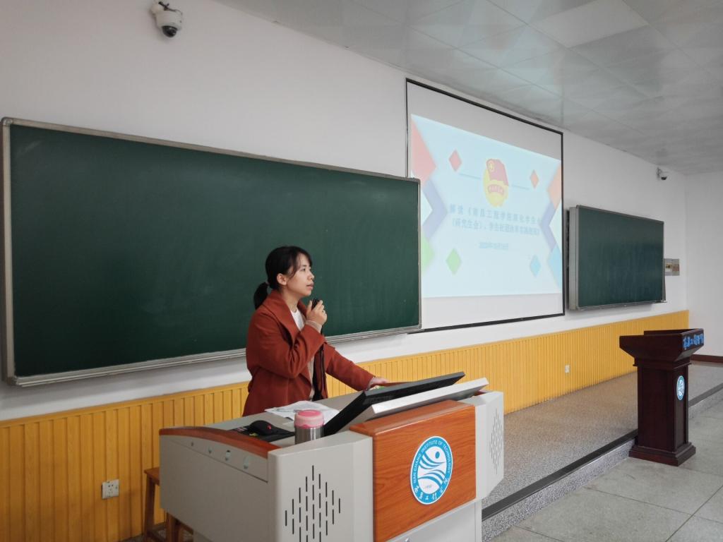 丁老师对《南昌工程学院深化学生会(研究生会)、学生社团改革实施细则》进行解读。首先详细介绍了本次学生会改革的政策依据,也简单介绍了中共教育部党组、共青团中央《高校学生社团建设管理办法》和学校内出台的一些政策文件。随后从强化党的领导、改革运行机制、精简组织机构、提升学生干部标准等七个方面对这些政策文件进行详细解读。