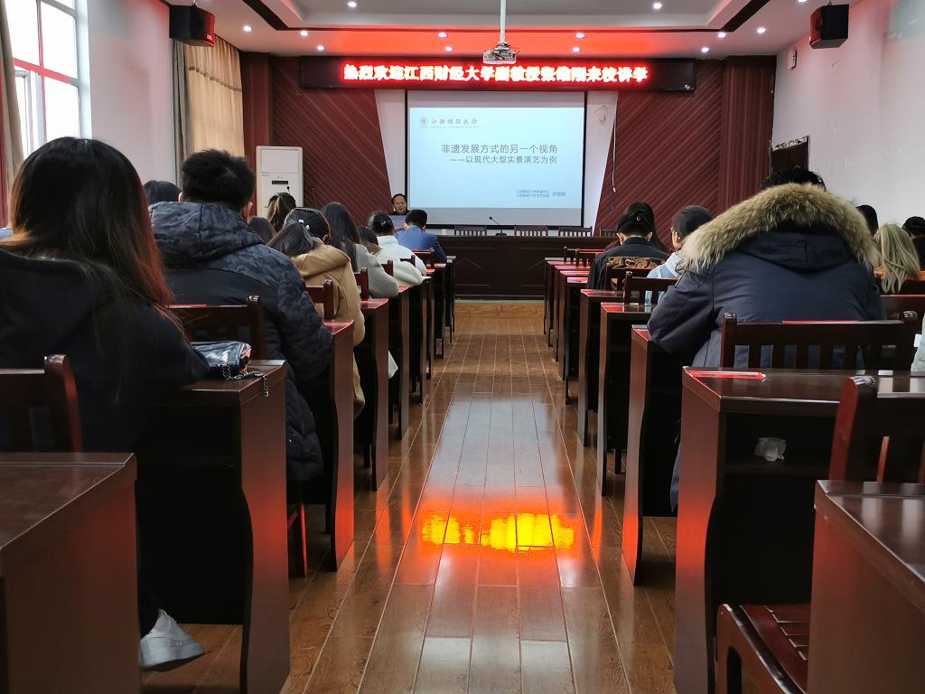 12月13日,江西财经大学张维刚副教授应邀做客“鄱湖学术讲坛”,在艺术楼A230会议室作了一场主题为“非物质文化遗产传承发展的现代方式--以现代大型实景演艺为例”的学术讲座,共有师生100余人聆听了讲座。