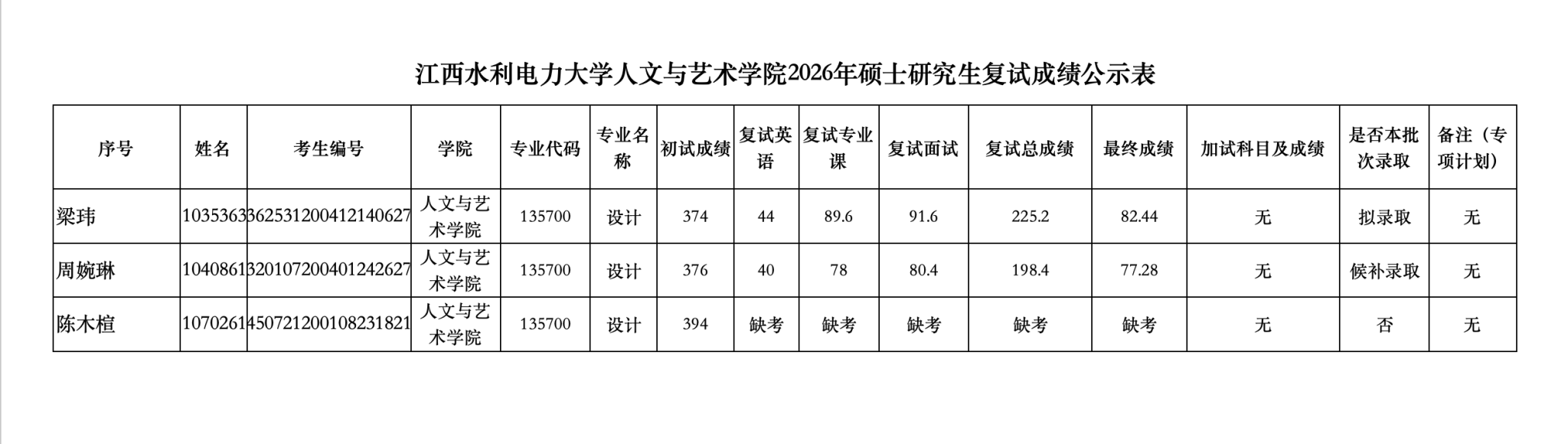 江西水利电力大学人文与艺术学院2026年硕士研究生调剂复试成绩公示