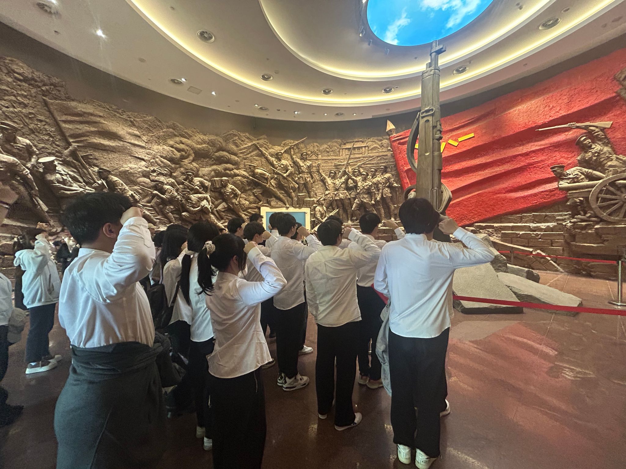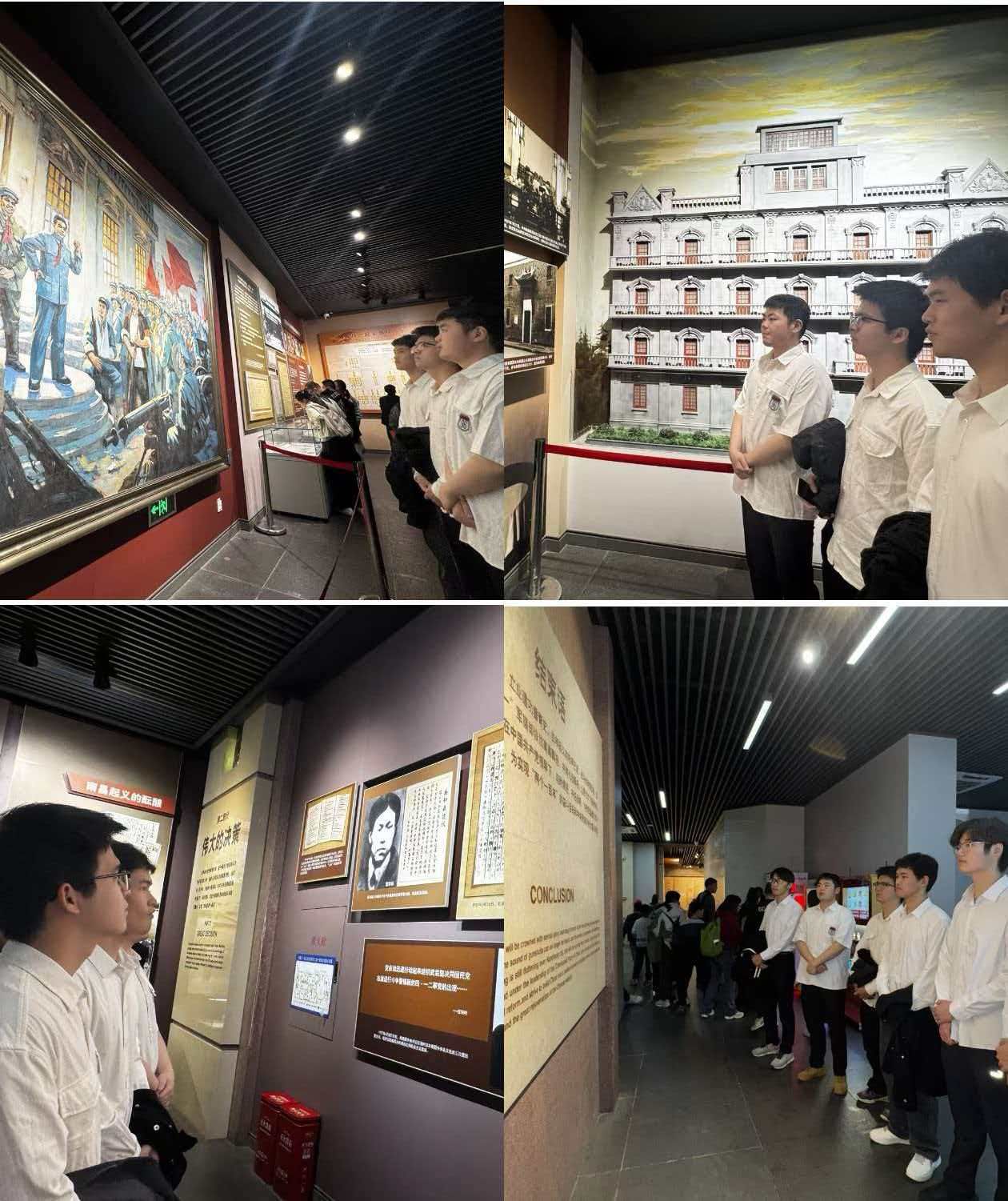 在序厅的“石破天惊”雕塑前,全体师生整齐列队,齐声高唱国歌,激昂的旋律在馆内回荡。随后,师生代表向革命先烈躬默哀,现场气氛庄重而肃穆。活动中,师生党员、团员青年在党旗、团旗前驻足凝视,感悟初心使命,进一步坚定了向组织靠拢的信念。仪式结束后,在讲解员的带领下,师生们参观了《南昌起义 伟大开端》基本陈列。一件件珍贵文物、一幅幅历史照片、一幕幕场景复原,生动再现了当年南昌起义的峥嵘岁月。师生们认真聆听讲解,不时驻足交流,深刻感悟革命先辈们为民族独立和人民解放不畏牺牲、前赴后继的伟大精神。